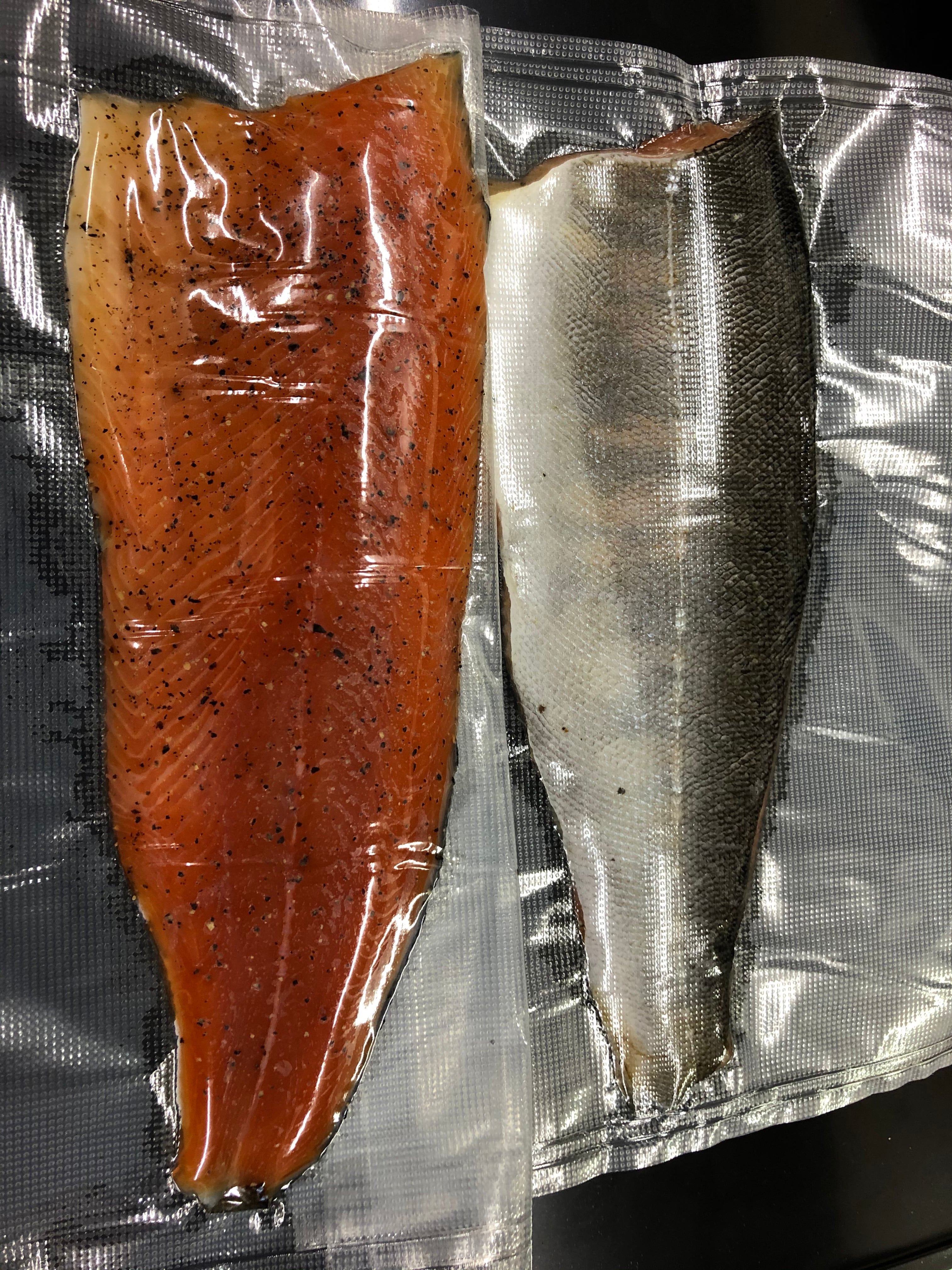 こちらの商品は燻製後に半身ずつ真空パック詰めしました。