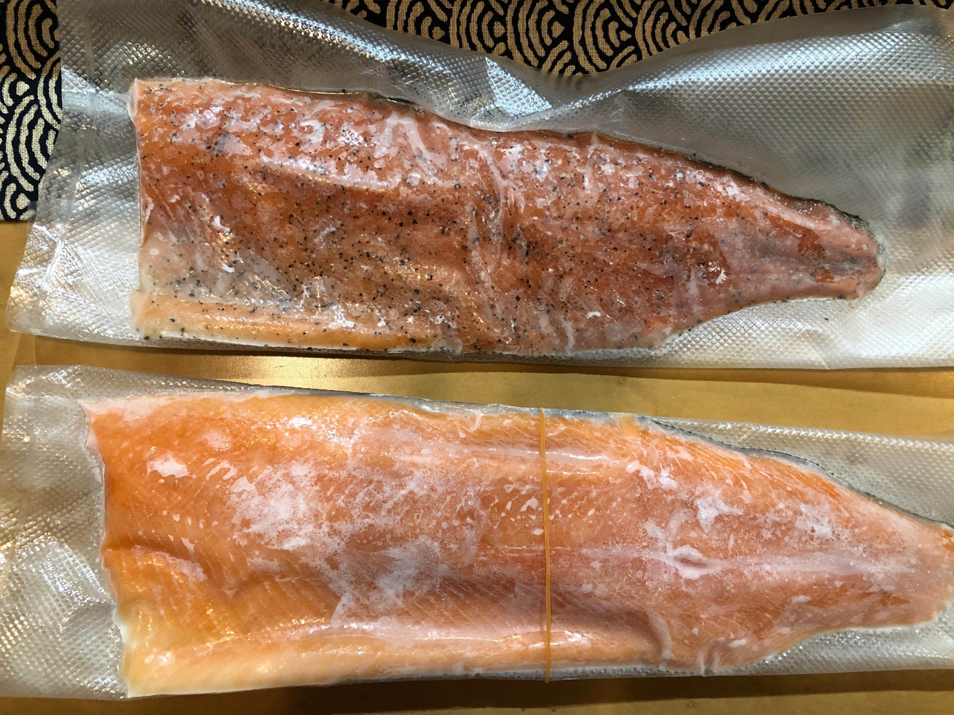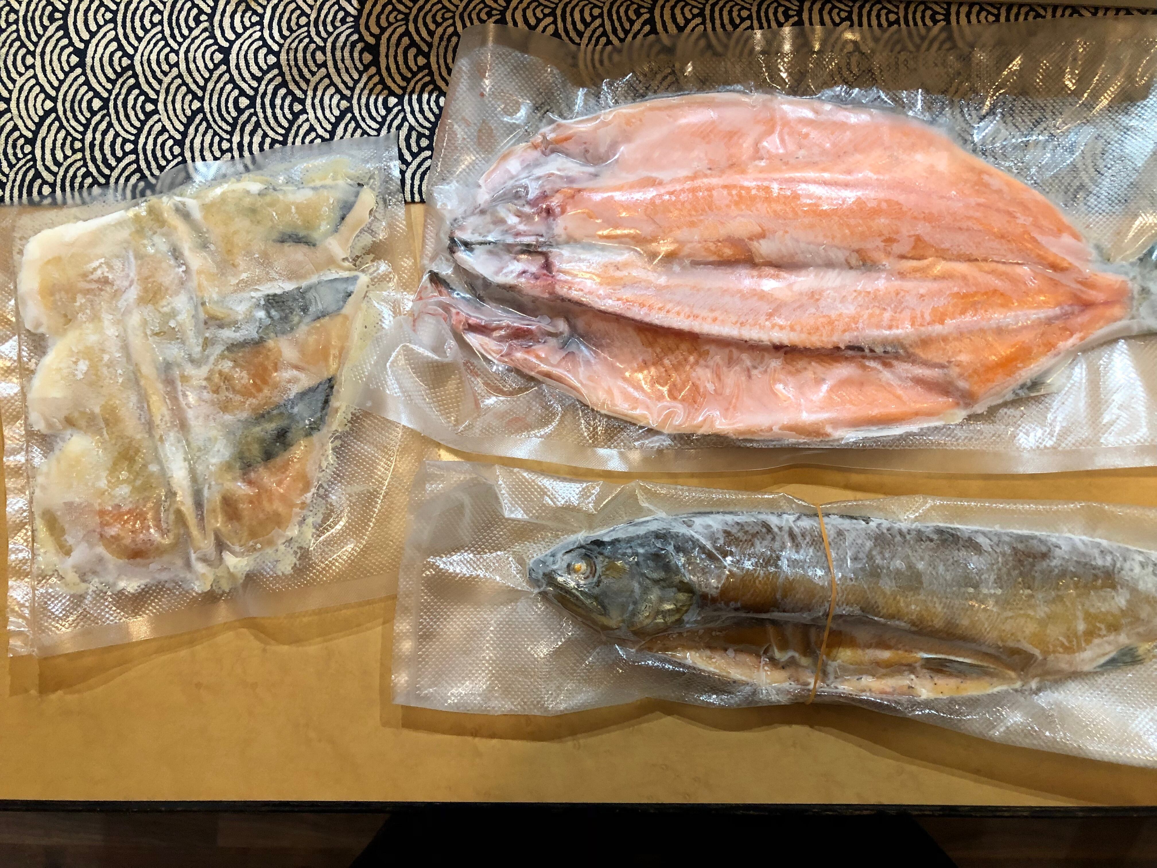 内容は ①お刺身用フィレ半身 ②自家製琵琶鱒の生ハム ③一夜干し1尾 ④燻製1尾 ⑤味噌漬け3切れ。